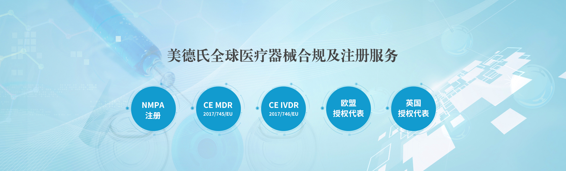 上海美德氏醫(yī)療科技有限公司觸及醫(yī)療行業(yè)熱點需求,提供專業(yè)法規(guī)解讀,專業(yè),誠信,可靠,真正為您的醫(yī)療產(chǎn)品出口的合規(guī)環(huán)節(jié)提供全流程解決方案! 美德氏涉及的服務包括醫(yī)療器械歐盟CE認證咨詢(mdr認證;IVDR認證),ISO 13485咨詢;美國FDA注冊(510K;QSR820);歐代美代;國內(nèi)NMPA注冊咨詢:醫(yī)療器械歐...